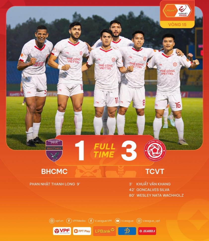 最终,Viettel以3-1击败Becamex TP HCM,领先第三名宁平队3分。若CAHN在首都德比中输给河内,Viettel与榜首差距将仅剩4分且多赛一场